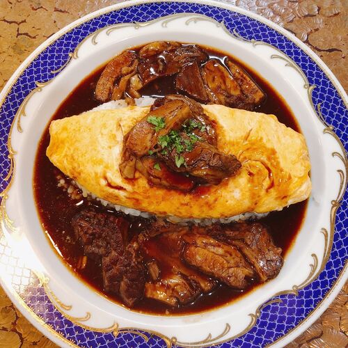 オムライスのビーフシチューのせという、名前からして魅惑的な料理。はじめにコンソメスープが出てきますが、このコンソメスープがまず驚きの美味しさ。程なくして、オムライスが登場。形を整えたごはんの上に、オムをまとめて、そこにさらにお店自慢のシチ…