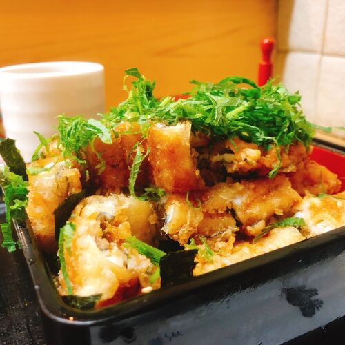穴子丼は数々あれど、こちらの穴子丼は異色、かつ、すこぶる美味である。 見た目からしても異色な穴子丼であるが、その実、穴子の風味、天ぷらの満足感、お皿全体でのバランス感、それらが緻密に計算され尽くしたお皿である。 大葉と白胡麻と刻み海苔などが…